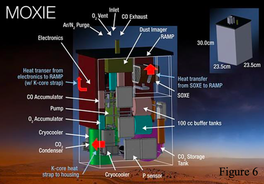 Since both the crops and astronauts require oxygen for aerobic respiration, the lack of oxygen in mars’ atmosphere is a large problem21. However, due to having access to sufficient electricity and an almost infinite amount of liquid water (addressed page 6), electrolysis of water is potentially a viable option to retrieve breathable O2.(2H2O → 2 H2 + O2). Another method of oxygen generation is known as MOXIE 19(Mars Oxygen ISRU Experiment); a prototype oxygen generator designed by NASA (Fig5). It utilizes zirconia electrolyte cells with thin electrodes coated with catalytic cathode and anodes. CO2 flowing over the cathode under electrical current causes it to be electrolyzed. Oxygen ions produced are driven though a solid oxide electrolysis stack and is oxidized, to produce an O atom. These atoms then combine and produce gaseous O2. Combining this technology with electrolysis of water should provide sufficient oxygen to all the astronauts and plants to grow healthily.
